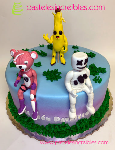 - Pastel de Fondant de Fortnite con Marshmello, Peely y Cuddle Team Leader.