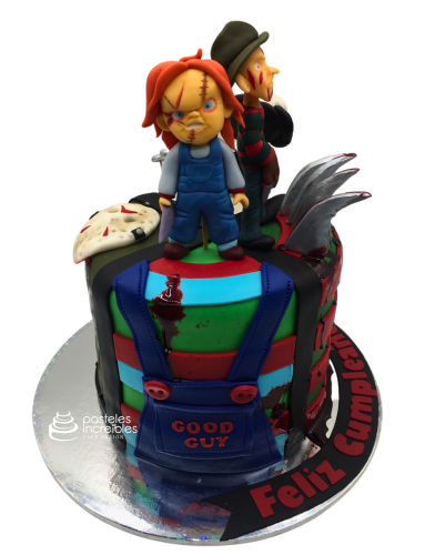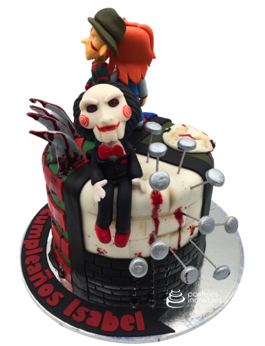 • Pastel de Fondant de Personajes Películas de Terror Freddy Krueger, Chucky y Saw.